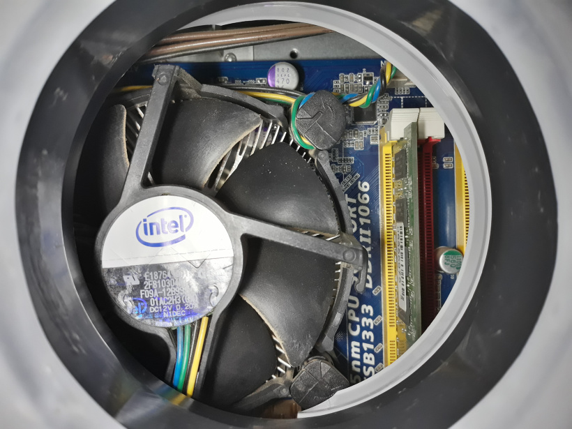 Фотография процессорного кулера и внутренностей системного блока через новый тубус (снято камерой смартфона сквозь внешнюю сетку с диаметром отверстий 2,5мм)