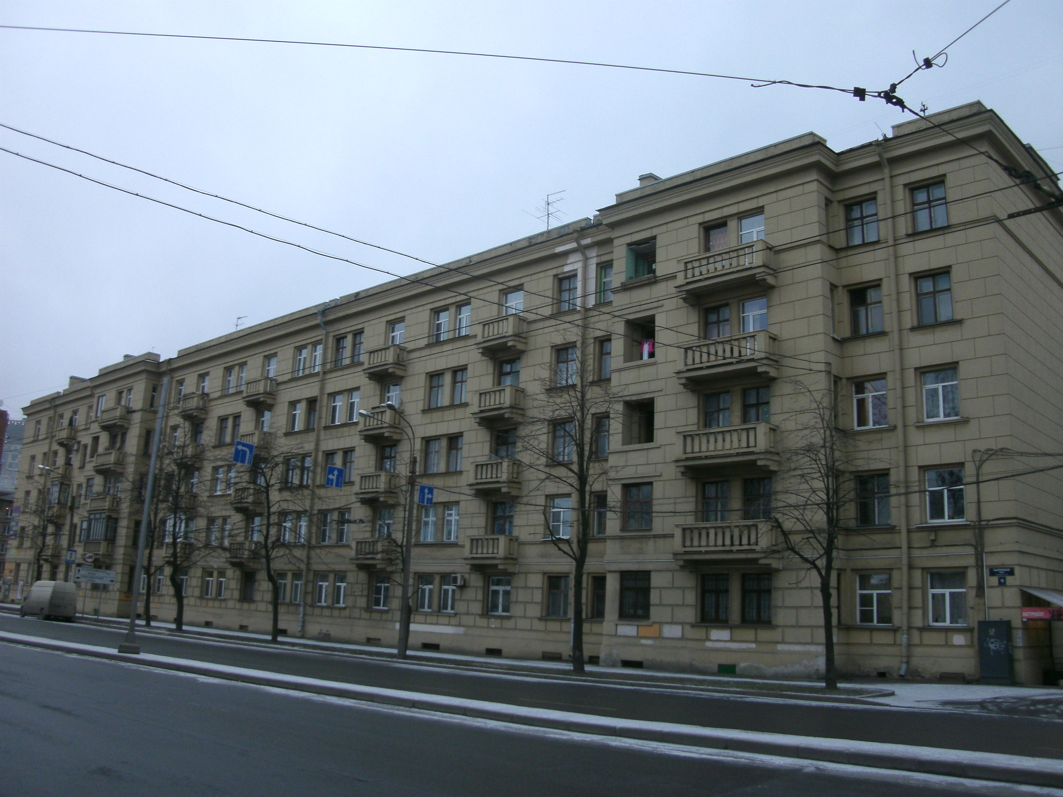 Дом, построенный в постконструктивисскую эпоху, но имеет черты как конструктивизма, так уже и ампира. Как пример последнего - балконы с колоннами.