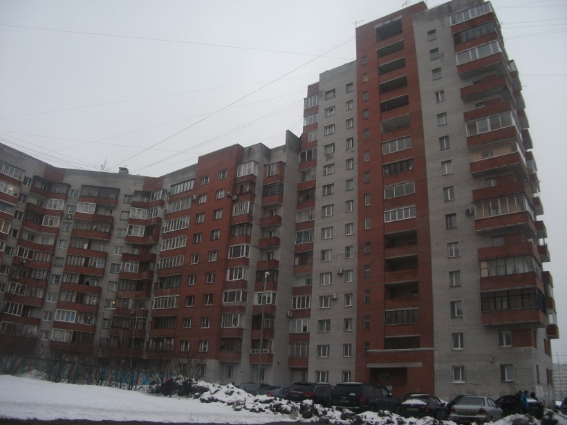 Протяженный кирпичный жилой дом построен в 1996г. вдоль красной линии проспекта Просвещения на участке между пр. Культуры и ул. Демьяна Бедного.