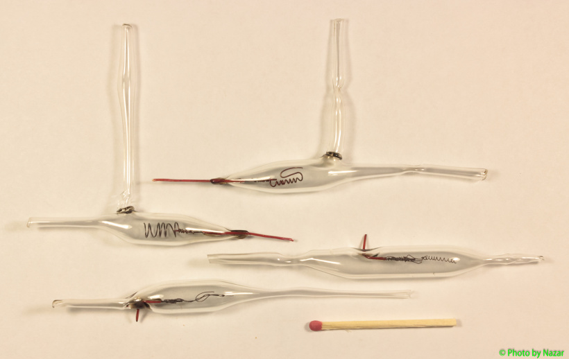 Небольшие колбочки с впаянными электродами и медными проволочками для использования в качестве геттеров (в данном случае поглощение газа за счет распыления металла в разряде). Изготовил их для будущей попытки сделать самодельную ЛЛ, там нужно будет убрать воздух из колбы лампы как можно лучше.