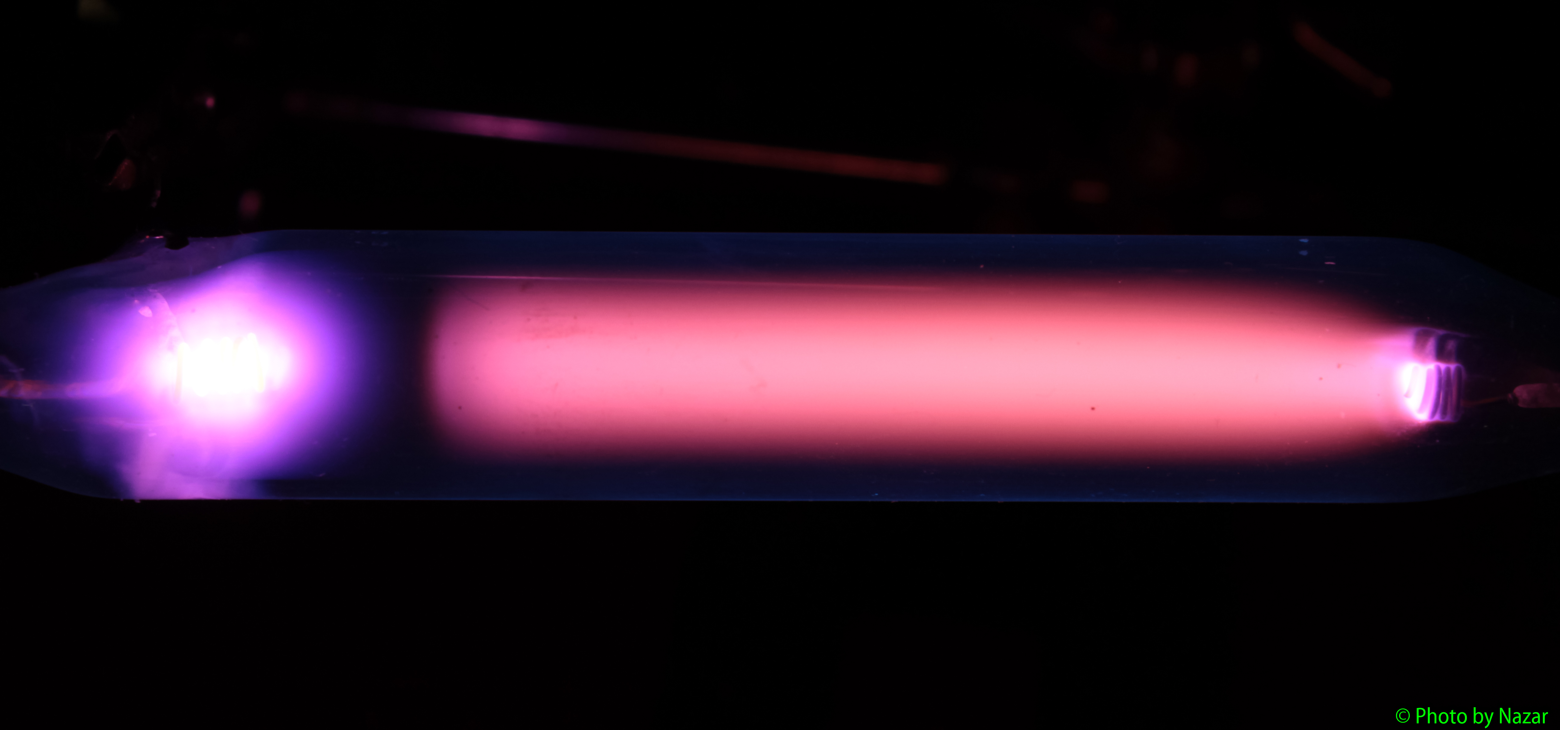 При повышении тока разряда оттенок положительного столба меняется с сиреневого на персиковый, что занятно. Думаю, дело тут в том что воздух это все же смесь разных газов и, например, чистый азот так бы себя не повел скорее всего.