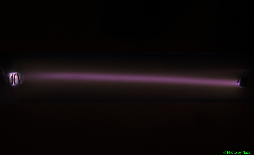 Не удалось точно передать цвет разряда, поскольку он довольно сложен и такой белесый с зеленовато-коричневатым оттенком. И в отличие от разрядов в водороде, углекислоте и воздухе в кислород сильно склонен к образованию диффузного свечения этого самого такого зеленовато-коричневатого цвета. По мере падения давления появляется такое осевое свечение розоватого оттенка, не знаю только принадлежит ли оно тоже кислороду, или же это небольшое количество азота виновато, который ввиду способа заполнения и откачки неизбежно также попадает в трубку. В будущем планирую сделать трубку с более чистым кислородом, с помощью термического разложения CuO.
