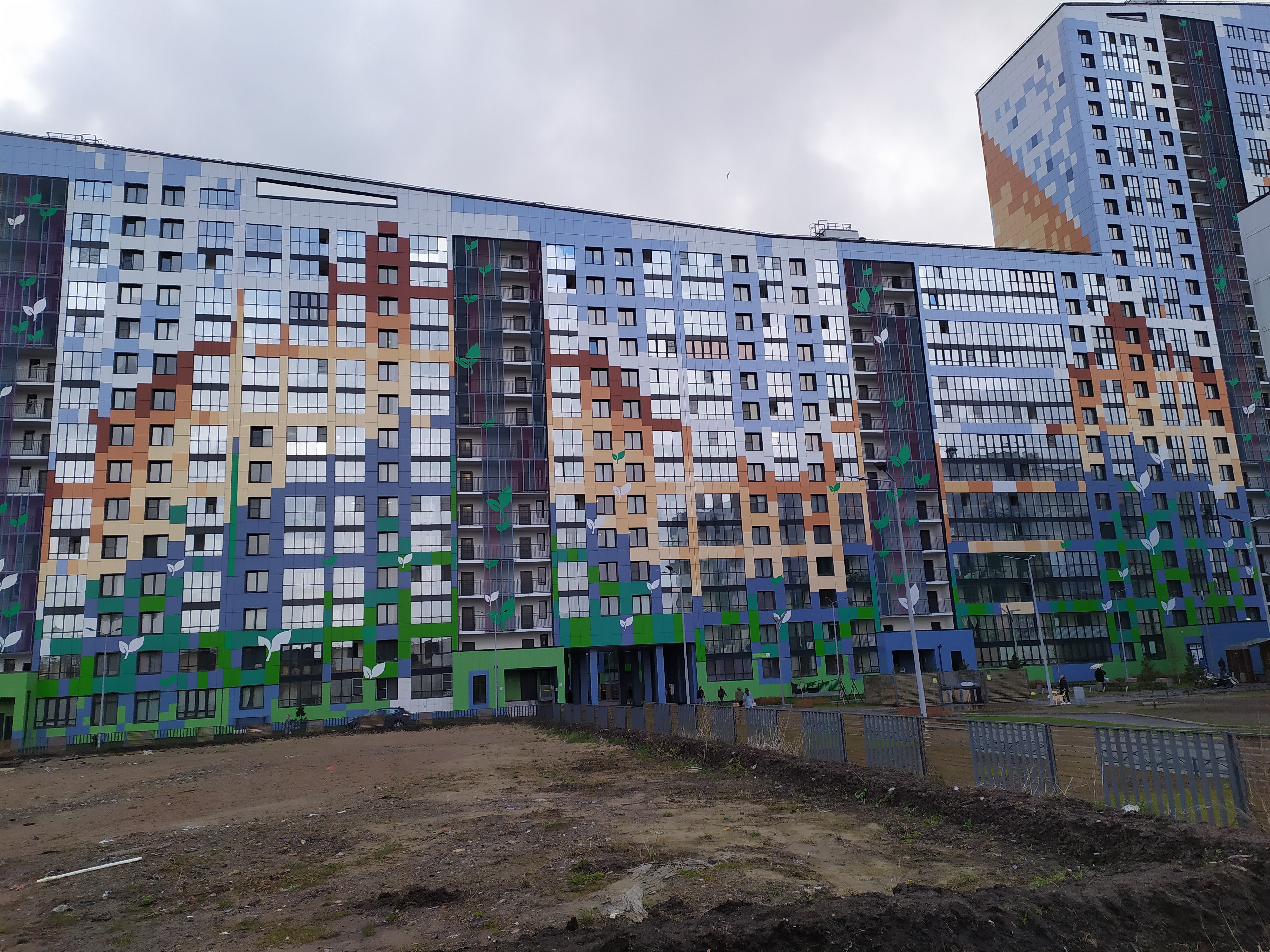 Ïðîåêò æèëîãî êîìïëåêñà ðàçðàáîòàëè â ÎÎÎ «Ïðîåêòíî-ïðîèçâîäñòâåííàÿ ôèðìà „À.Ëåí“». Äîìà ïðåäñòàëè â âèäå 8 Êèðïè÷íî-ìîíîëèòíûõ 25-ýòàæíûõ ïëàñòèí ñ ïðèñòàâëåííûìè ê íèì ìåíåå âûñîòíûìè ñåêöèÿìè. Äëÿ ðàçíîîáðàçèÿ ôàñàäû èõ îáëèöåâàëè ïëèòêîé ðàçíûõ îòòåíêîâ. Îíà îáðàçóåò àáñòðàêòíûå êîìïîçèöèè â äóõå ïèêñåëüíîé ãðàôèêè. Òàê, íà ñòåíå êîðïóñà, âûõîäÿùåãî ê Íåâå, óãàäûâàåòñÿ ãîðà íà ôîíå íåáà. Ñèëóýò ñîçäàåòñÿ çà ñ÷åò ñêîøåííûõ «êðûø» è òîðöåâîãî ðàçìåùåíèÿ îäèíàêîâûõ êîðïóñîâ âäîëü óëèöû Êðûëåíêî.