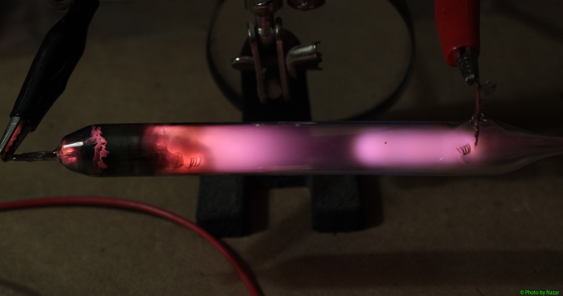 К сожалению, достаточно чистый неон в этой трубке не получился. И поэтому свечение имеет вот такой цвет из-за примеси воздуха.