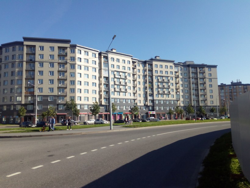 Самый большой кирпичный дом, построенный как в этом квартале, так и во всей Московской Славянке. 40 секций и 1381 квартиру. Соседний дом, практически точно такой же, но имеет на 9 квартир меньше.
