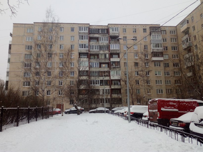 На фото парадные 1-3 дома серии 1ЛГ-602В, состоящего из нескольких типовых проектов, пристроенных друг к другу под прямыми углами. Нумерация квартир продолжается безостановочно.