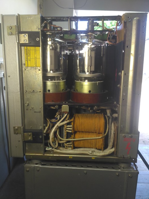 | Генераторные лампы на самодельных панелях и их трансформатор накала |
