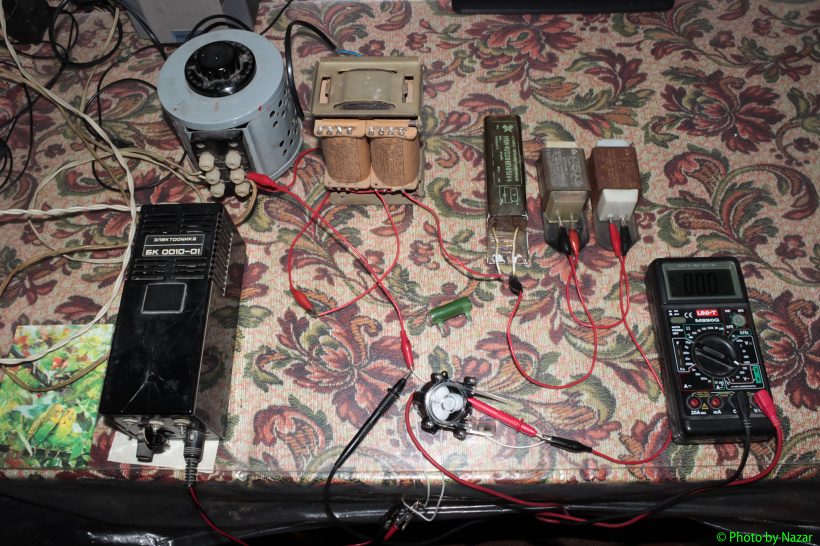 В качестве источника питания использовался ЛАТР с вольтодобавкой с помощью трансформатора ТС-180-2, который добавлял в схему 220В еще раз. Балластом для ограничения тока в цепи стартера работали три дросселя для ламп 40Вт, включенные последовательно (при более низком напряжении включал только два их), а также порой резистор ПЭВ-10 6,2кОм.