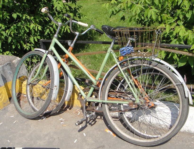 Оба, похоже, конца 70х. По крайней мере, не-складные "Салюты" были до начала 80х. У ближнего - цепь ржавая и сухая вхлам. Неужели не тяжело так крутить педали?