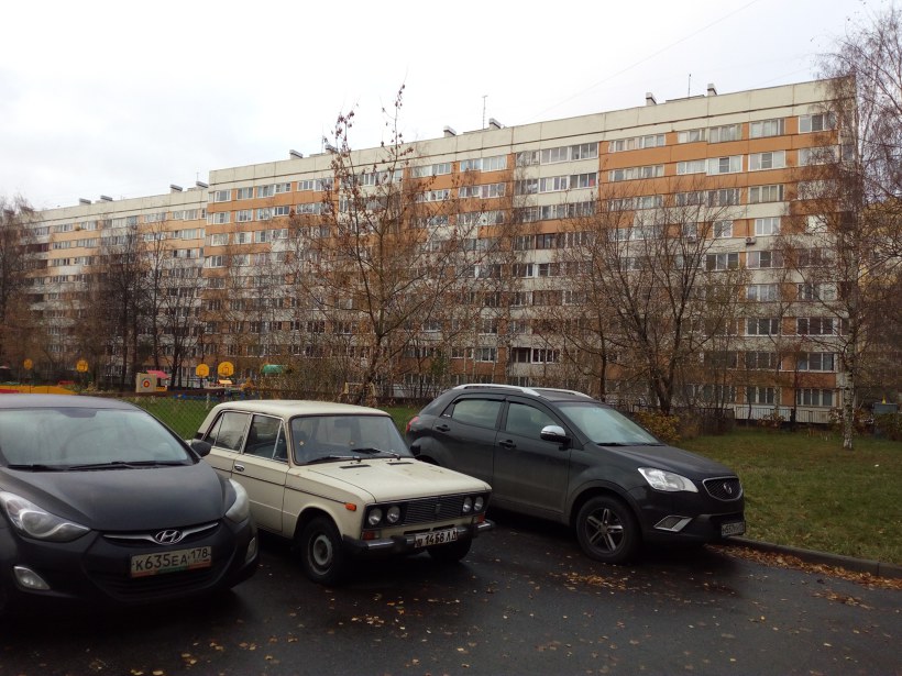 На фото парадные 1-6 дома серии 1ЛГ-600А, состоящего из двух трехсекционных домов и одного двухсекционного которые пристроены друг к другу со смещением и под углом в 90 градусов, образуя букву Г.