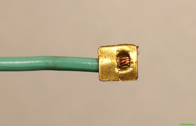 Казалось бы, вполне технологичное решение. Потому что нет необходимости в пайке. Однако при опрессовке жилы проводов могут повредиться. Да и сам обжим в данном случае не особо прочен. Все это способствует через некоторое время отрыву проводов от данных латунных лепестков. Такая проблема присуща и тому же "Дзвіночку": https://ixbt.photo/?id=photo:846479. Полностью проблема устранятся с помощью пайки (переопрессовка все равно будет иметь меньшую надежность). Данную операцию выполняю бывает у гирлянды по ссылке по мере необходимости. И у гирлянды на фото такой ремонт тоже потребовался. Надо бы все лепестки у обеих пропаять но пока лениво.