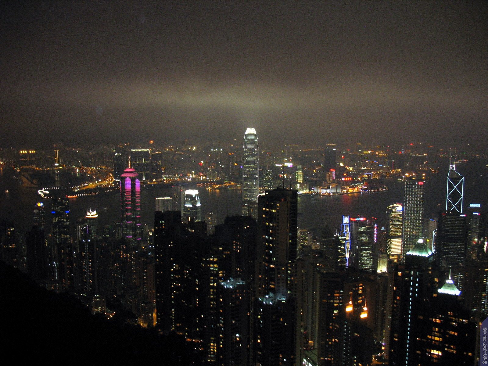 Пик Виктория, вид на вечерний Гонконг (северная часть острова и полуостров Коулун через пролив)