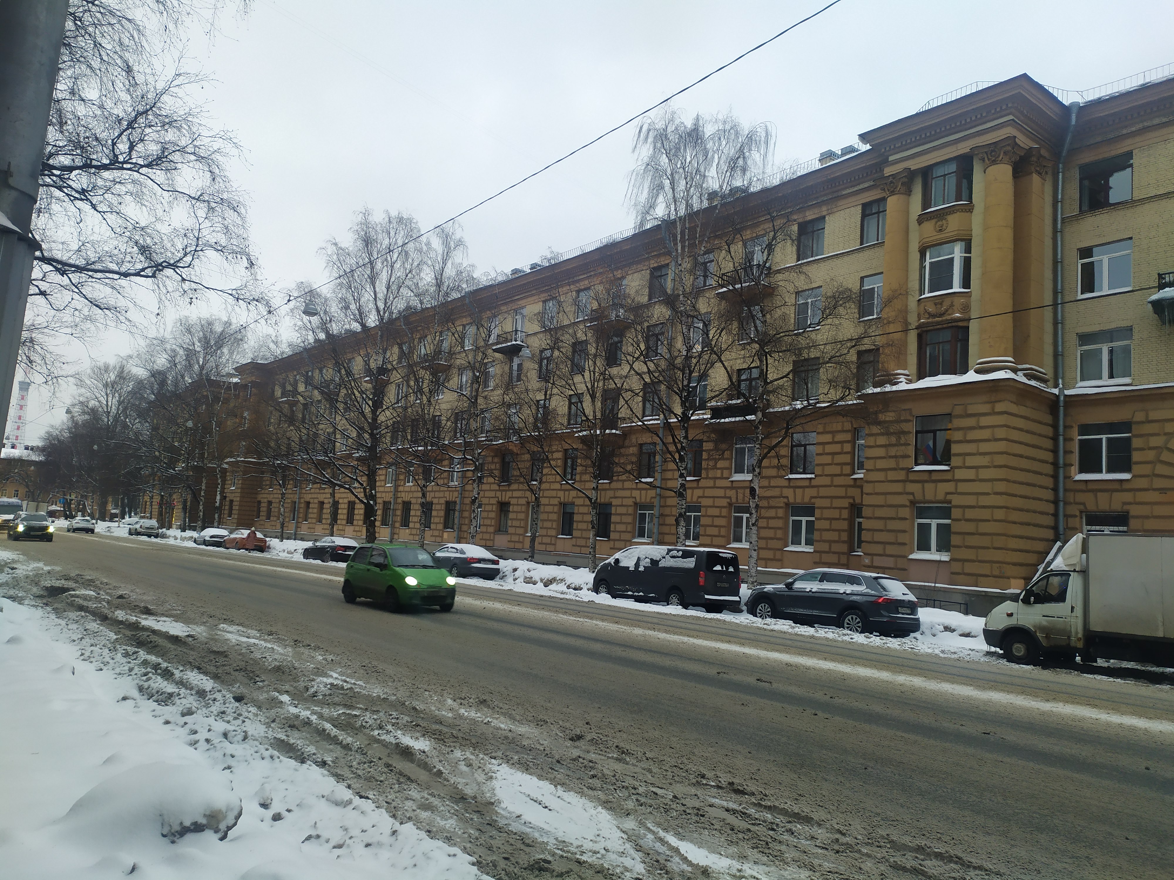 Пятиэтажный жилой комплекс 1956 г. постройки, замкнутый дом-исполин в виде трапеции, состоит из нескольких корпусов, образующих замкнутый двор в форме вытянутой трапеции. Выходя узким торцом в сторону Лесного пр., комплекс занимает всю ширину квартала между Литовской и Новолитовской улицами.