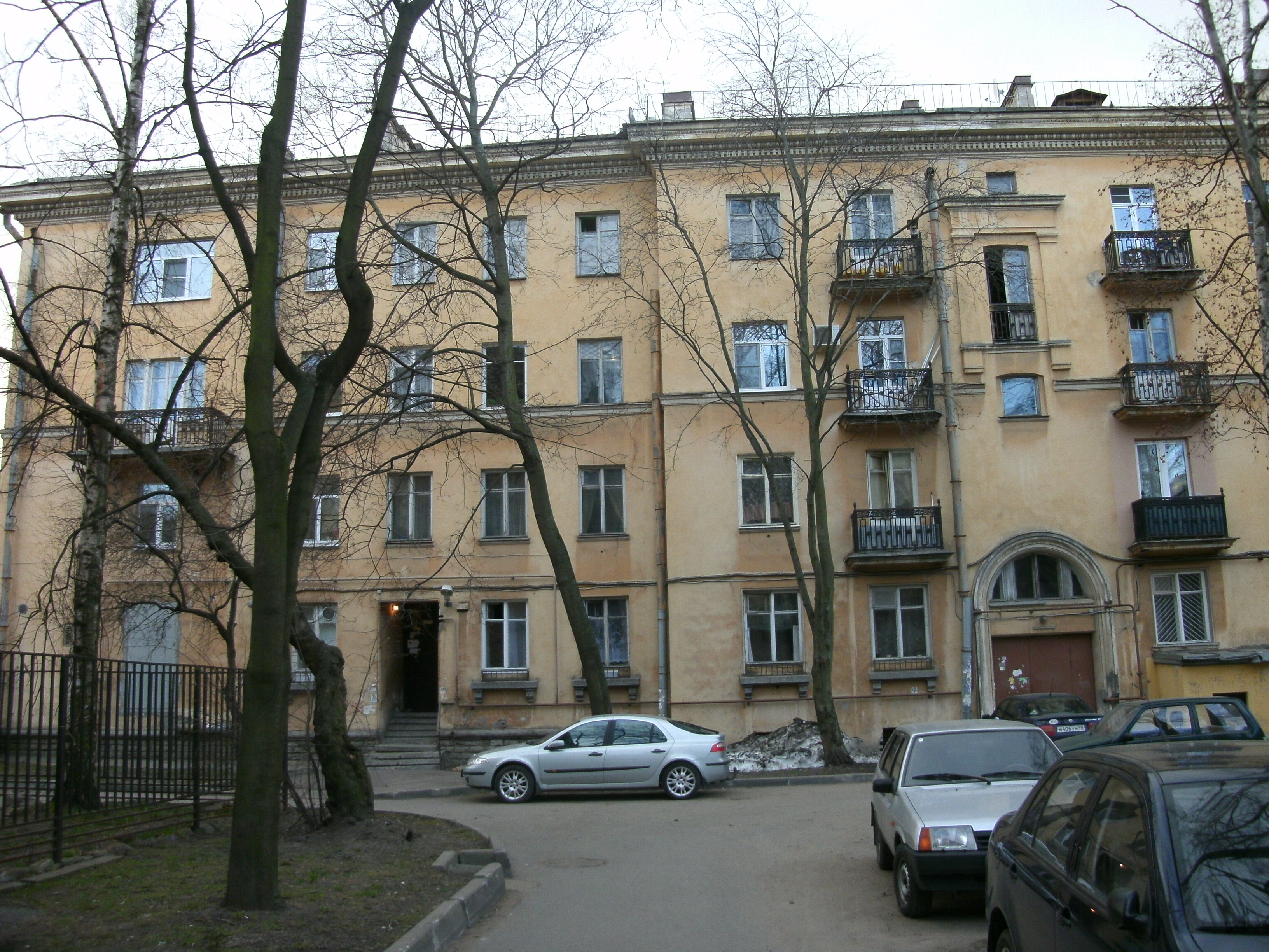 Четырехэтажный жилой дом послевоенной постройки на углу Удельного и Скобелевского проспектов. В плане П-образный. Оштукатуренный. На каменном цоколе. С лепным карнизом по верху и простым - в уровне подоконников 3-го этажа. Балконы верхних этажей с металлическими ажурными решетками и кронштейнами. В некоторых трехчастных оконных проемах сохранилась первоначальная столярка, украшенная вытянутыми колонками. В первом этаже по Скобелевскому пр. - торговое помещение с тремя большими полуциркульными проемами.