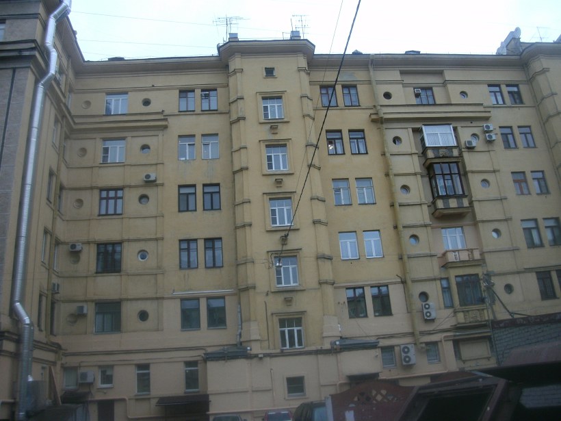 Если первый этаж покрыт рельефной штукатуркой "с выбоинами", то выше штукатурка становится гладкой, но при этом ее украшают небольшие изображения самых различных животных. А многочисленные балконы дома украшены натюрмортом из плодов. Круглые окошки напоминают о конструктивистском прошлом архитектора. Балконы во дворе по внешнему виду не отличаются от балконов на лицевых фасадах. Возможно, детали для них отливали по одной опалубке и не стали ее менять.