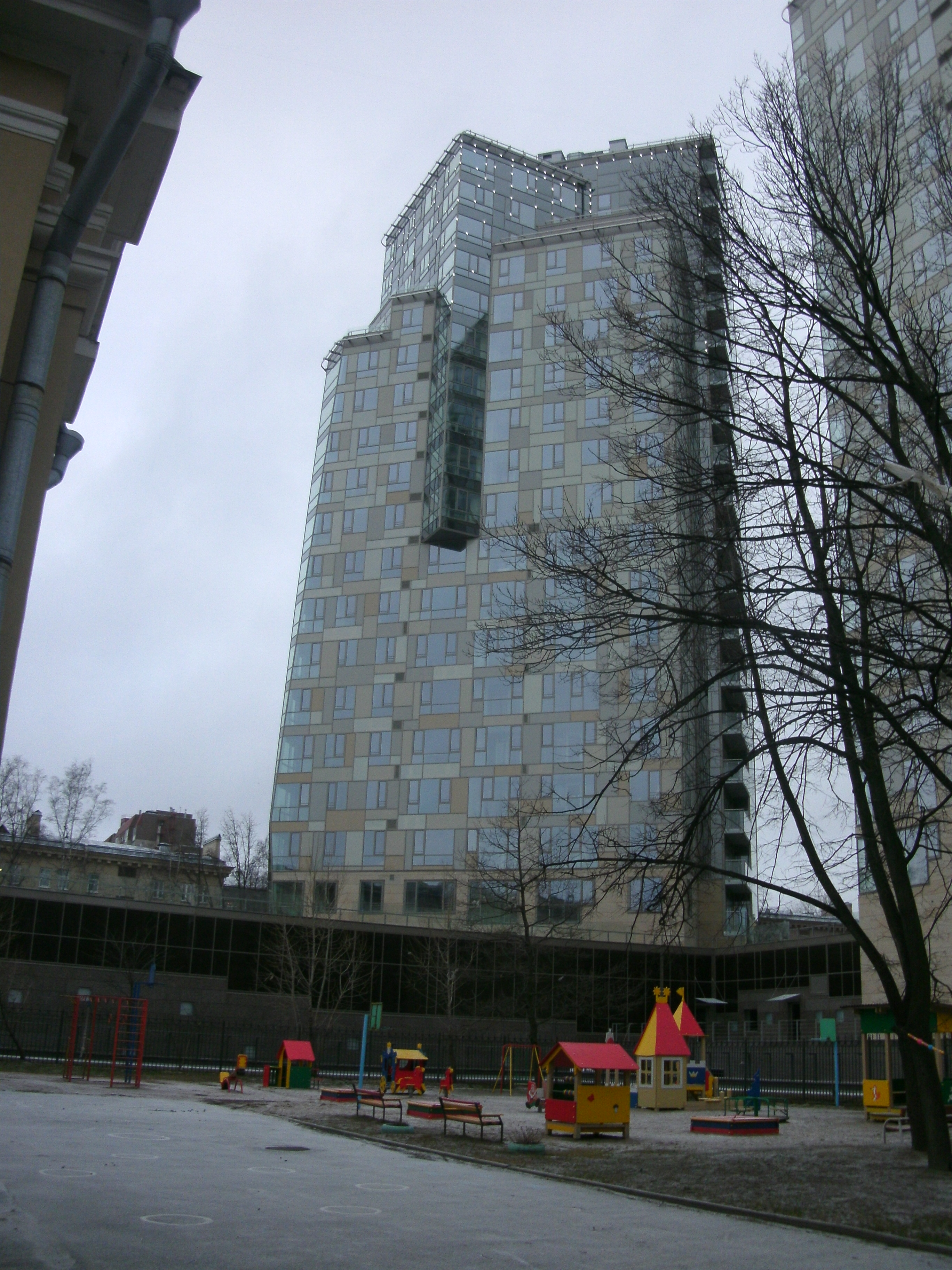 одноэтажная - занимающая почти всю площадь участка, три многоэтажных блока высотой 18, 20, 22 этажа. Каждый блок завершается тремя - пятью этажами пентхаузов, отступающих от плоскости фасадов, и окруженных эксплуатируемыми террасами.