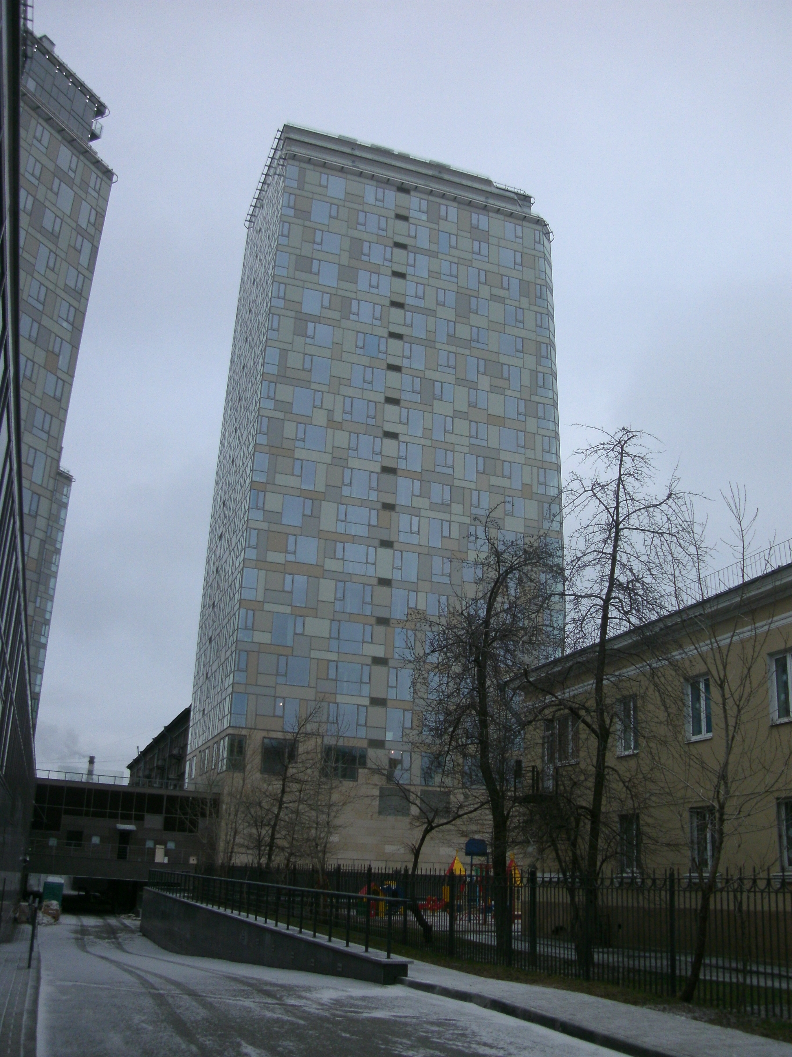 одноэтажная - занимающая почти всю площадь участка, три многоэтажных блока высотой 18, 20, 22 этажа. Каждый блок завершается тремя - пятью этажами пентхаузов, отступающих от плоскости фасадов, и окруженных эксплуатируемыми террасами.