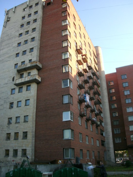 два кирпичных общежития Политехнического института между которыми находится гостиница Орбита, открывшая свои двери в 1979г. Во дворе дома 6 находится Мемориальная фонтан "Блокадный колодец". 1978-1979. Арх. А.Я.Свирский, скульптор М.Л.Круппа.