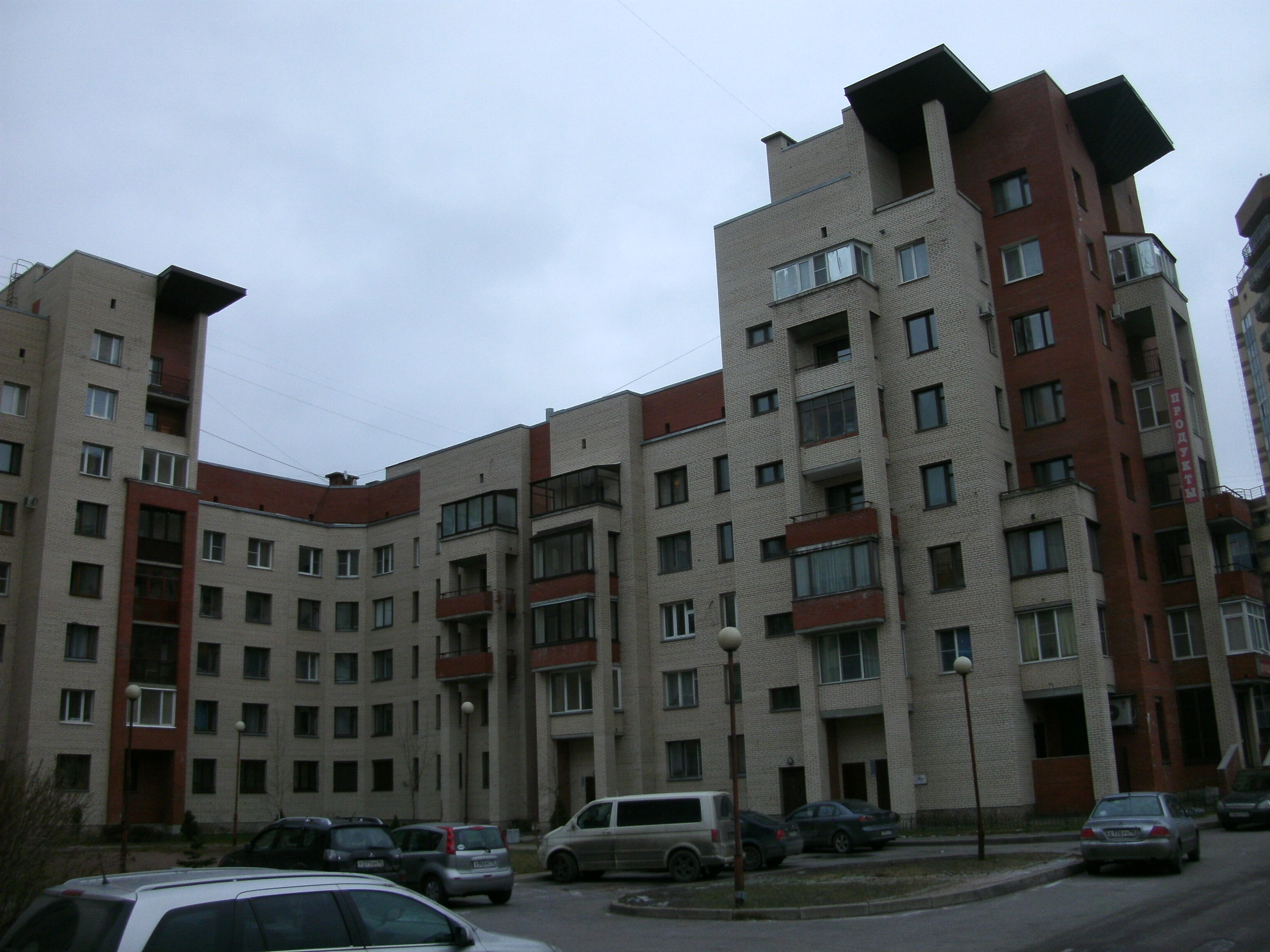 Построен компанией "Строительный трест". Имеет форму буквы "Ш".