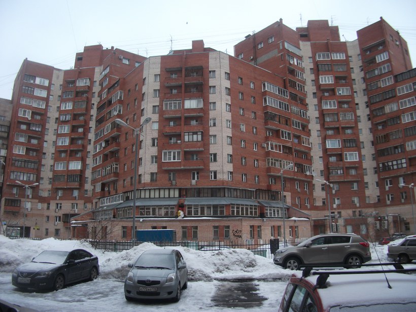 Протяженный кирпичный жилой дом построен в 1996г. вдоль красной линии проспекта Просвещения на участке между пр. Культуры и ул. Демьяна Бедного.
