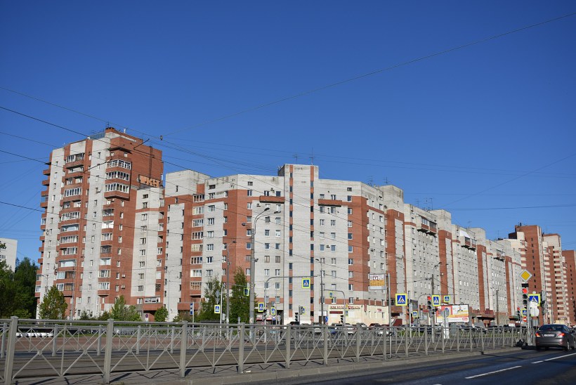 Протяженный кирпичный жилой дом построен в 1996г. вдоль красной линии проспекта Просвещения на участке между пр. Культуры и ул. Демьяна Бедного.