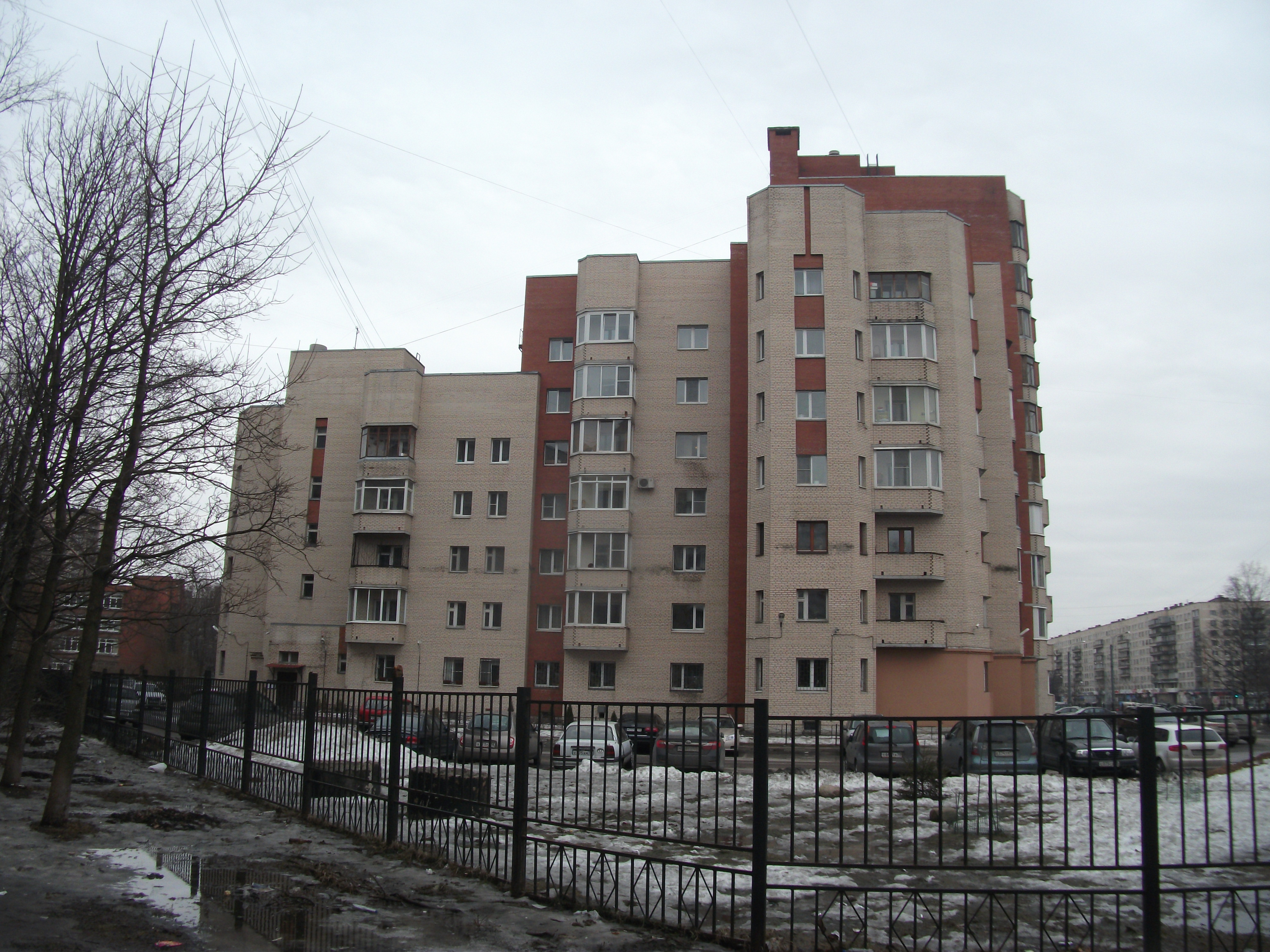 Один дом имеет два адреса и отдельную нумерацию квартир. На пр. Луначарского выходят две секции по 16 этажей, а на пр. Художников три с последовательным сокращением этажности.