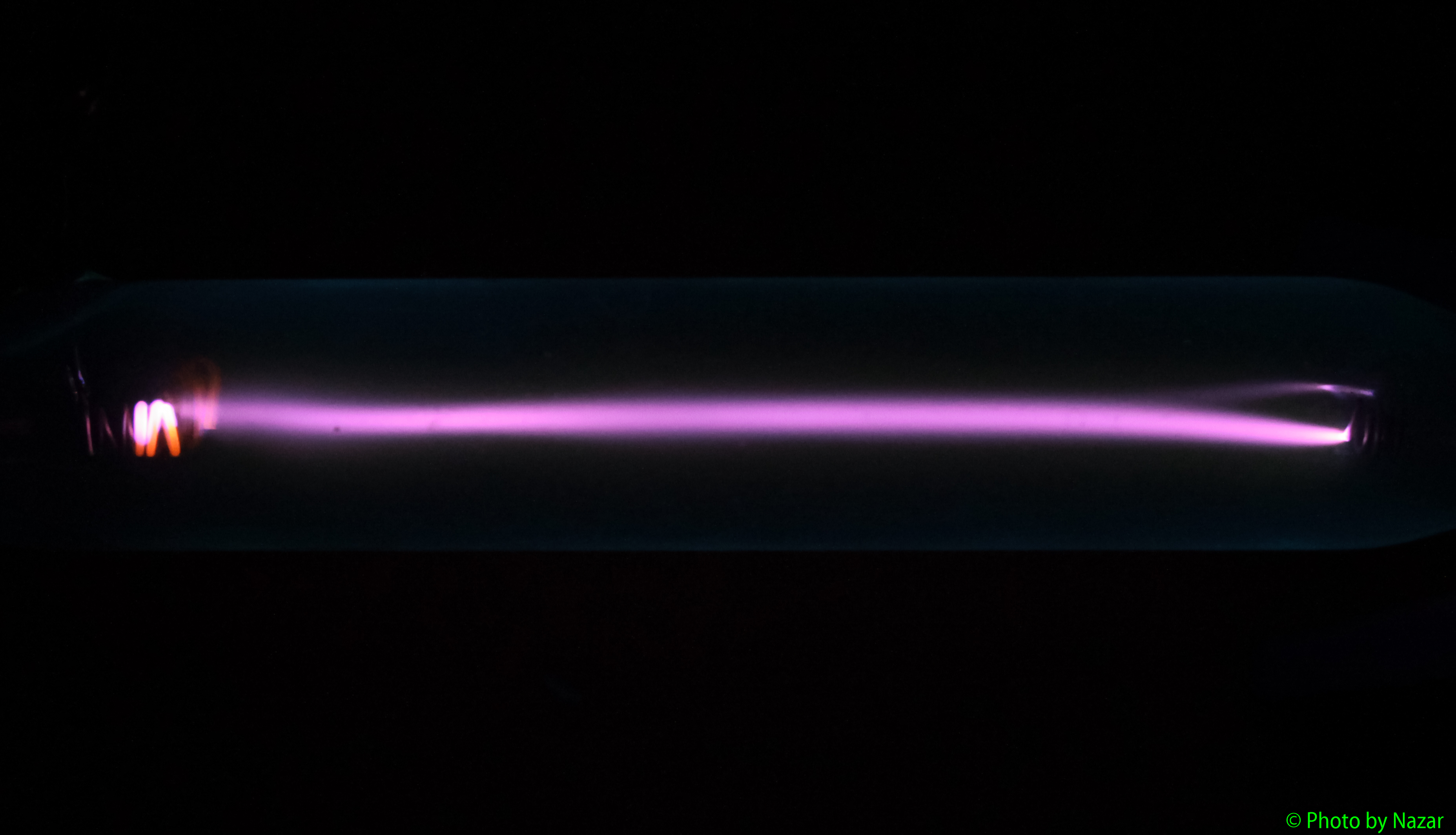 Давно хотел получить разряд в воздухе в виде вот такого длинного шнура, но не было подходящего источника питания. Теперь благодаря регулируемому источнику на основе ТДКСа это удобно и несложно. Шнурок получается относительно ярким и окружен еле-еле заметным бело-зеленым тонким ореолом (фотоапарат его не "увидел"). Ввиду неглубокого разрежения такой разряд теоретически должен просуществовать долго, хоть титановый катод трубки и будет постепенно переходить в оксиды и нитриды.