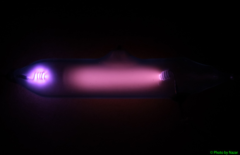 Снимок без коррекции оттенка, поэтому разряд по свечению на воздушный похож - цвет аргона фотоаппаратом без правки передать хорошо невозможно (в отличие от того же воздуха).