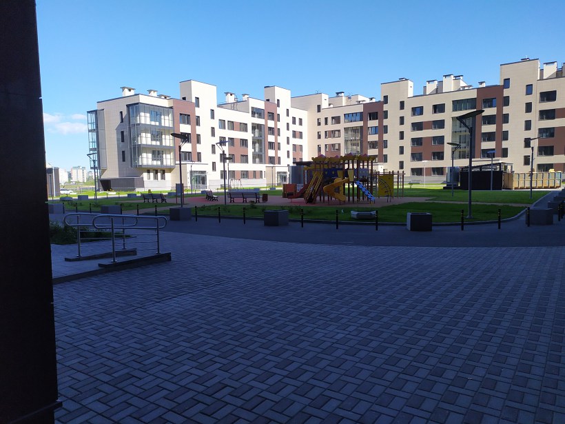 Отделка всех корпусов выдержана в едином скандинавском стиле. Навесные вентилируемые фасады из высокопрочного керамогранита выполнены в теплых коричнево-бежевых тонах с применением серых акцентов. Такое цветовое решение создает дополнительное ощущение комфорта, что так важно в климатических условиях Северной столицы.