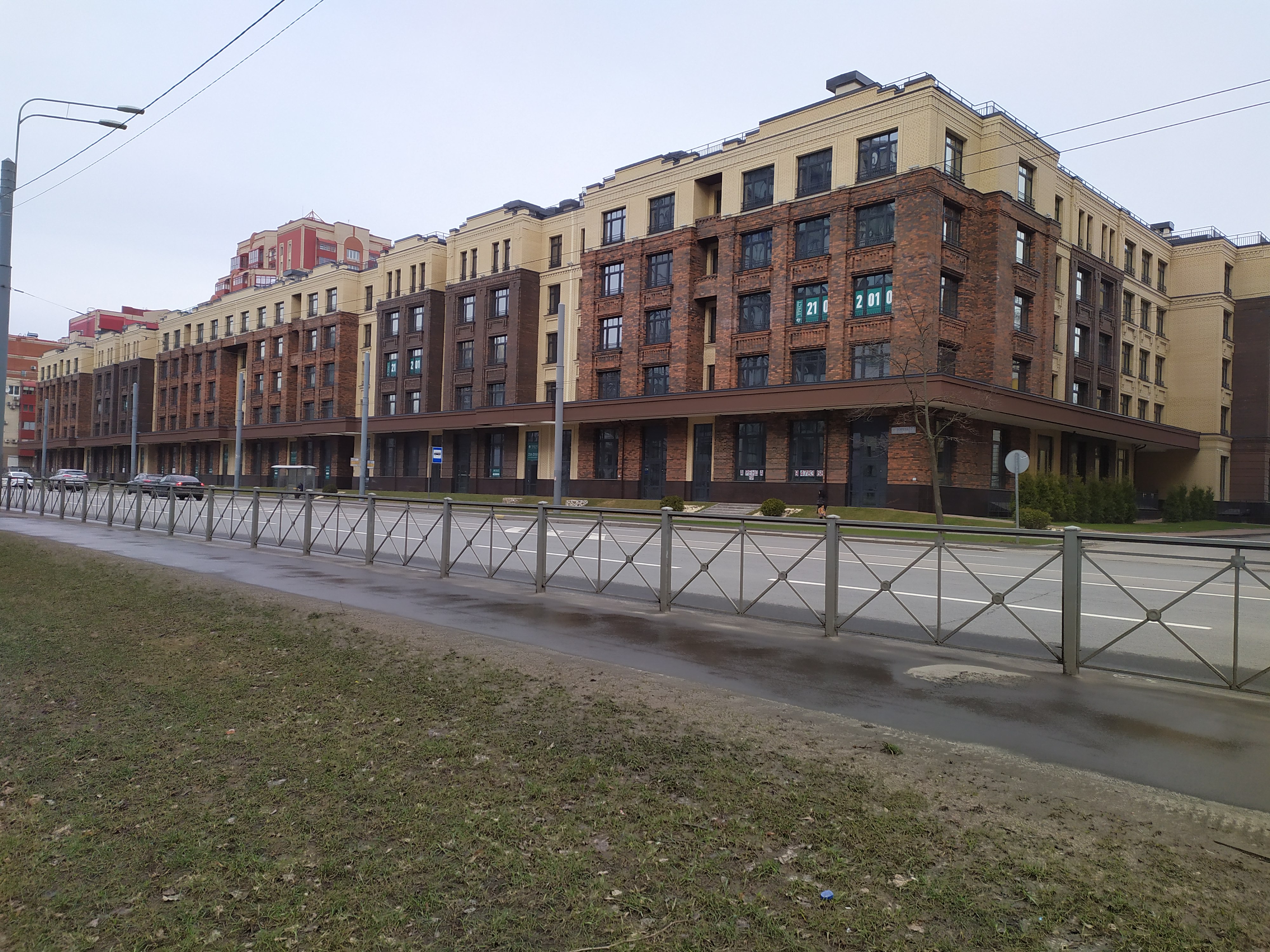В Выборгском районе Санкт-Петербурга построен новый ЖК. Он получил название «Сосновка». Застройщиком выступал ЗАО «Строительный трест». Перед строительством многоэтажного дома были расселены двухэтажные «немецкие коттеджи». В мае 2017 года Госстройнадзор выдал компании разрешение на строительство дома высотой 16 метров — пять этажей. Проект разработала студия «Архитектурная студия Арзиманова И. Б.». К работам на площадке приступили в конце 2017 года.