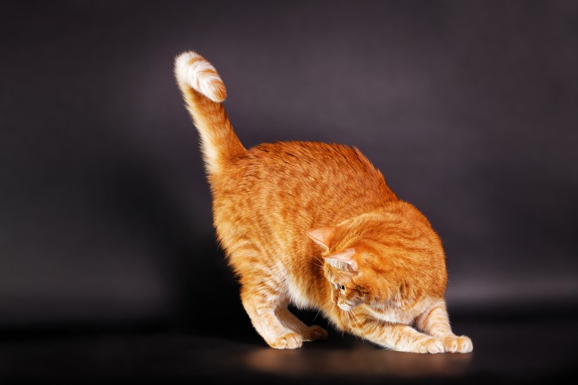 - ImageDescription: Playing ginger cat on dark background