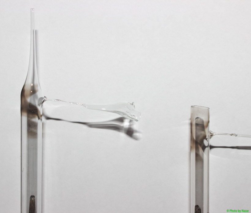 Не догадался ранее, что можно просто сильно нагреть бок трубки и достаточно сильно вытянуть ее. Вытягивание осуществляется с помощью быстрого "приклеивания" к еще не успевшему застыть стеклу другой трубки с запаянным концом. Для этой цели отлично подходят отломанные штенгели от ламп накаливания, например (есть небольшой запас горелых лампочек для такого). На фото, правда, для вытяжки использовал остатки трубок гораздо большего размера. Но они не очень подходят - площадь "склеивания" небольшой получается и часто успевает вытянуться слишком тонкая стеклянная нить, которая рвется. Хотя длинная нить из стекла получается все равно поэтому нужно работать осторожно. Так как если ее разбить - найти может быть непросто из-за прозрачности.