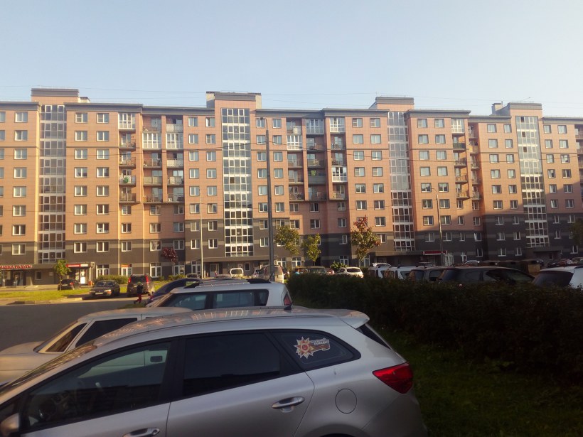 Достаточно большой кирпичный дом, построенный в Московской Славянке, но не самый большой ни в квартале, ни в самом микрорайоне.