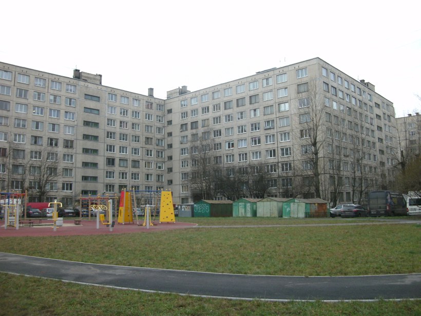 Один из самых больших домов в Купчино серии 1ЛГ-602В. Угловые секции с одной стороны от типового проекта распложены ступенькой, а с другой - угловые секции чередуются с прямыми "обрезанными" с рядом балконов на уличном фасаде.