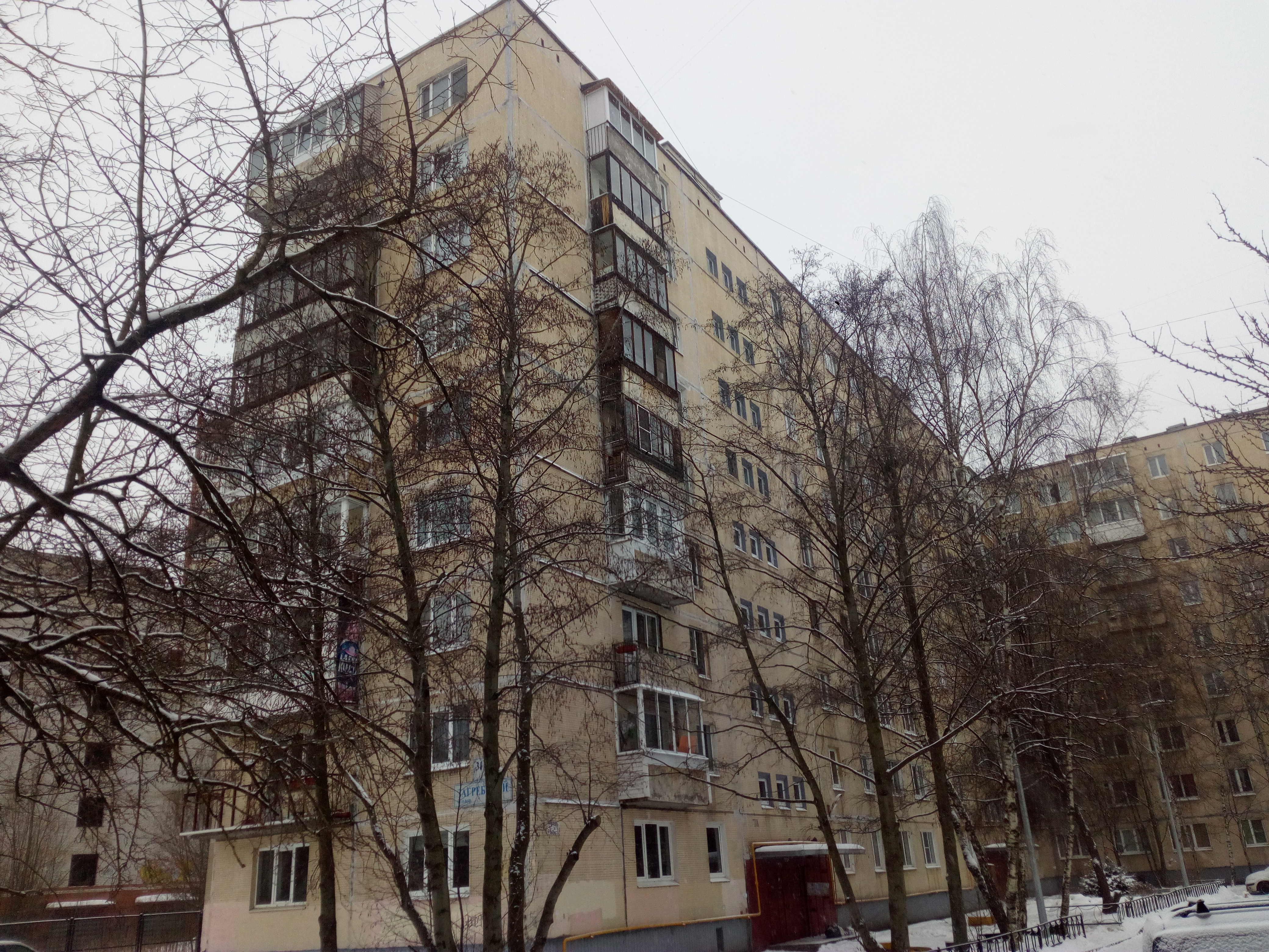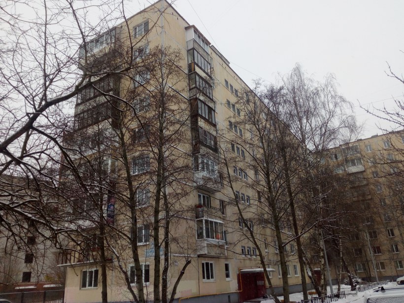 На фото парадные 1-3 дома серии 1ЛГ-602В, состоящего из нескольких типовых проектов, пристроенных друг к другу под прямыми углами. Нумерация квартир продолжается безостановочно.