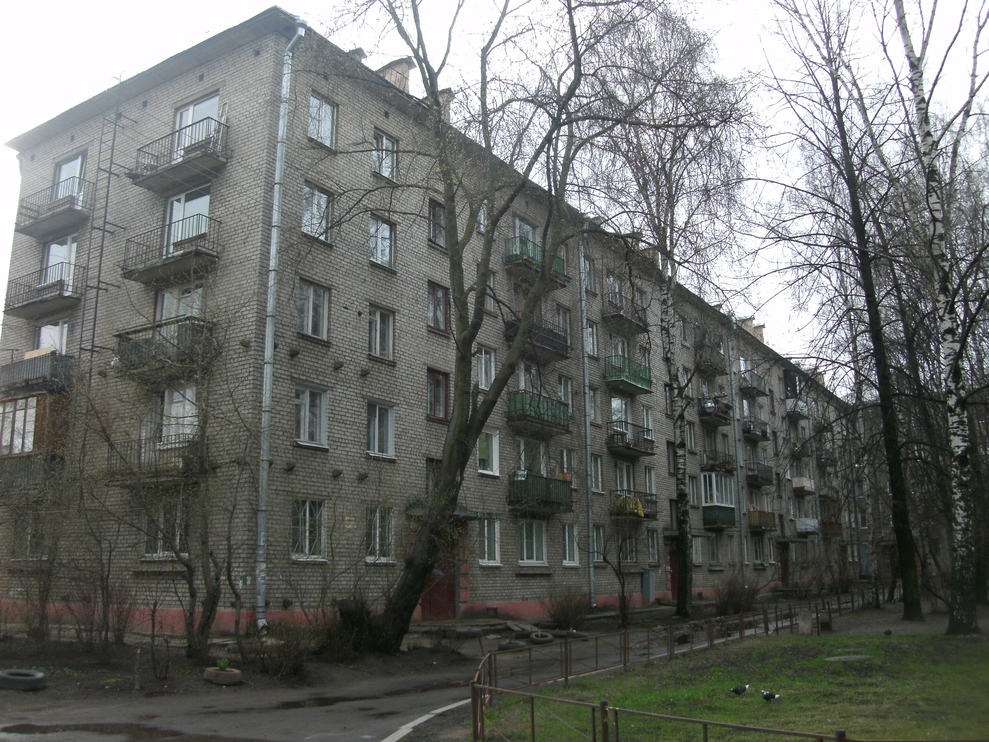 Первый этаж этих домов нежилой и чаще всего отдан под магазины. Окна парадных находятся с обратной стороны по отношению ко входным узлам. Балконы есть на обоих фасадах. А со стороны где окна парадных они Г-образные на два окна и только со стороны торцов.