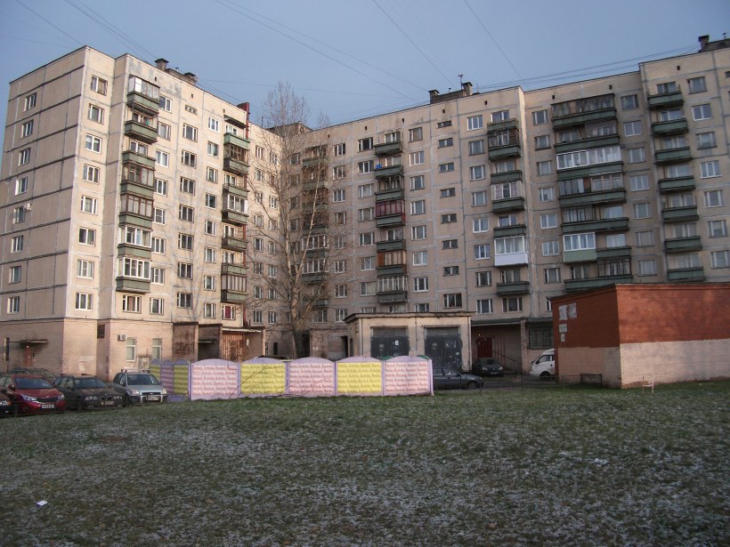 Этот дом полный аналог типового проекта середины 1970-х годов ( http://ixbt.photo/?id=album:69459 ) за исключением того, что построен дом в 1984г. (с соответствующими изменениями тех годов постройки) т.к. под ним, за несколько лет до этого был запущена станция метро Гражданский пр. Первый этаж не жилой и отдан под магазины.