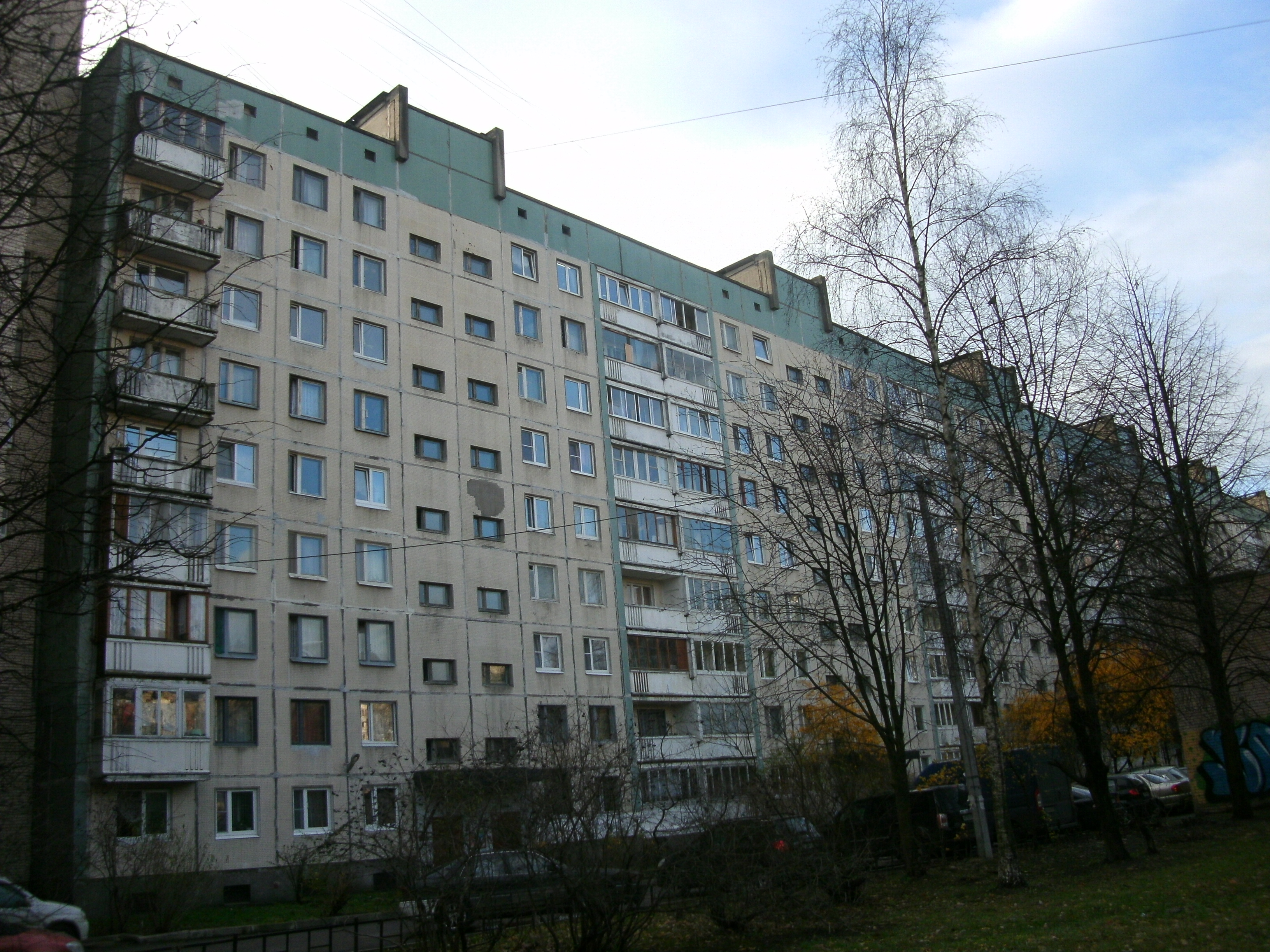 У этого дома оба торца изменены. К одному пристроен дополнительный ряд балконов с 3 по 9 этаж под которыми находится арка. Эти балконы принадлежат другому дому данной серии. Второй торец глухой и пристроен к кирпичному дому повторного применения ( http://ixbt.photo/?id=album:69789 ). А балконы которые должны быть на торце, находятся на фасаде.