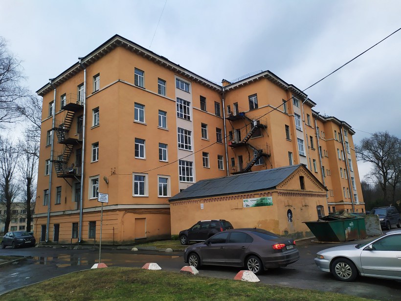 У этого дома, построенного изначально под общежитие, коридорная система и связанные между собой парадные - войдя в одну парадную, можно попасть в любую другую.