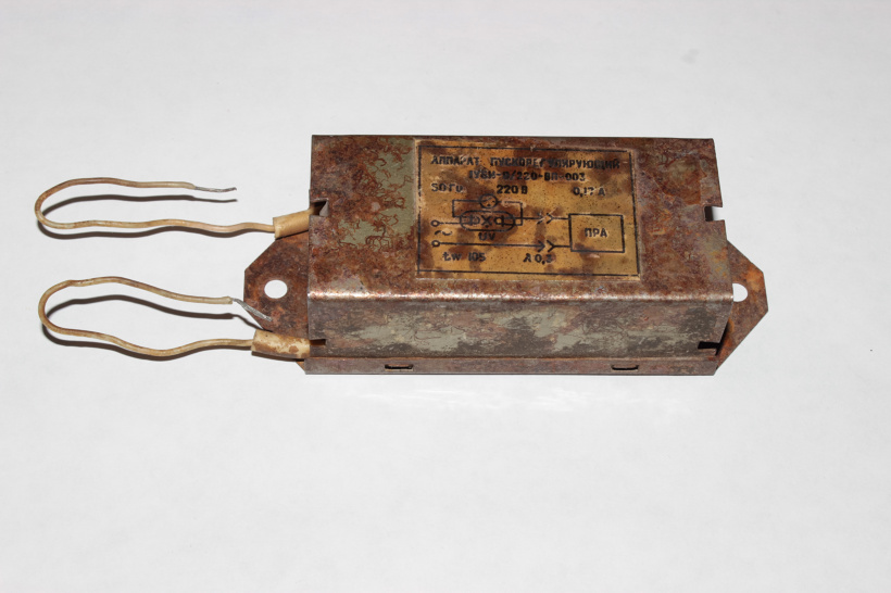 tw 105, λ 0,3 , R(DC) 108,4Ω. Старый дроссель для одной ЛЛ Т5 8Вт, судя по обозначению лампы на схеме на этикетке "UV" этот ПРА предназначен для кварцевых бактерицидных ламп. И так оно и есть, в альбоме в Студента-электрика есть фото обеззараживателя с таким же дросселем: http://fotkidepo.ru/?id=photo:994736 .